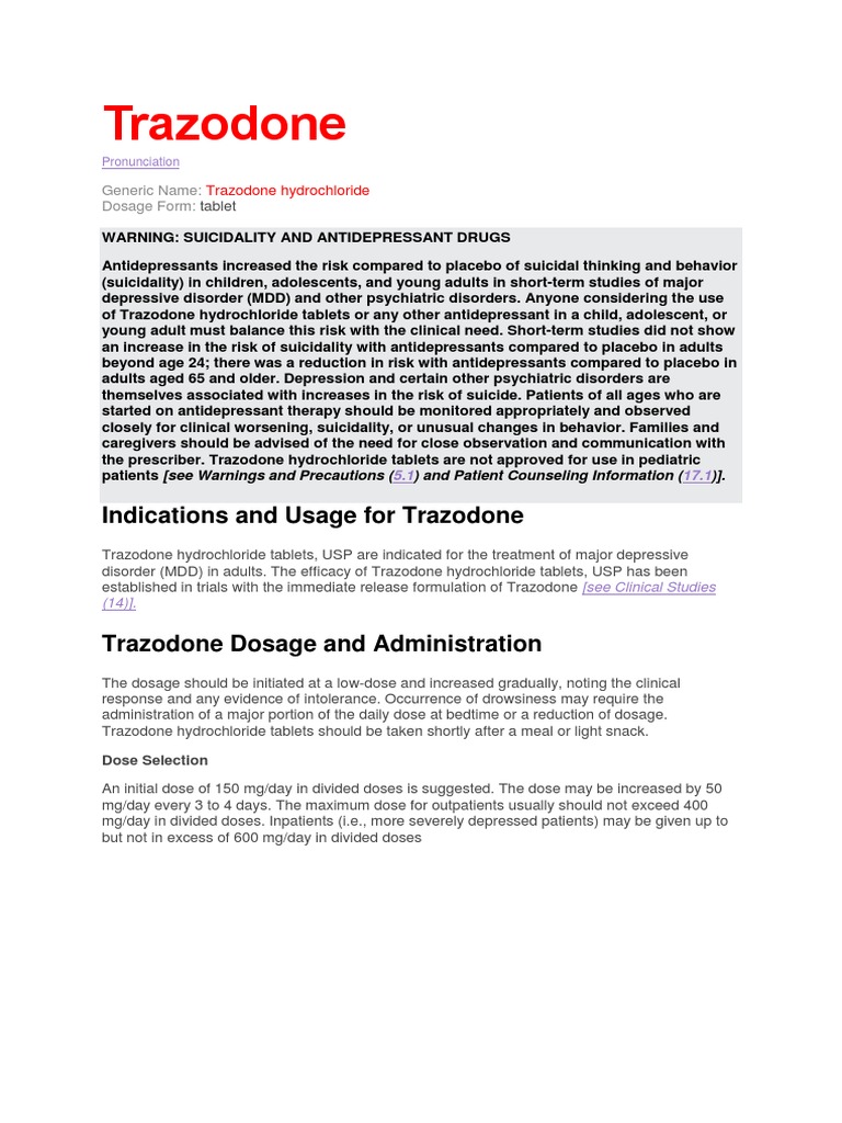 Sep 11, 2024 · Easy-to-read patient tips for Trazodone covering how it works, benefits, risks, and best practices.